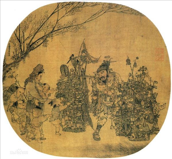 此图为李嵩风俗画的代表作。绘货郎挑担下乡,一群村童围拢过来,争看担上货物的情景。人物神态刻画生动,主要以墨笔勾描为主,近于白描画法,略施淡彩,画法极为生动。